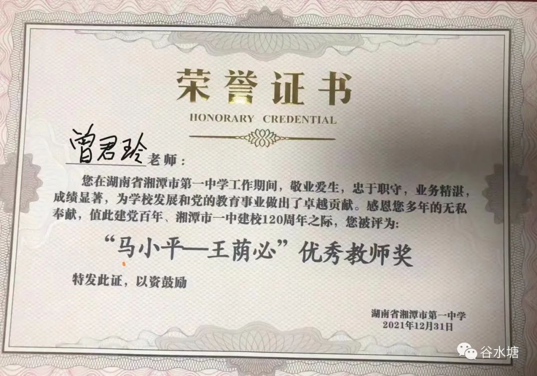 曾君玲老师1943年出生于湘乡,1948年随父亲到四川宜宾生活,1964年毕业于西南民族学院数学系,分配到四川省重点高中江安中学(原四川省立三中)任教,1972年因照顾夫妻关系调回湖南邵阳任教,首先在邵阳纺织厂厂电大班辅导,后来在厂子弟学校教高中数学,1985年调入湘潭市一中任教至1998年退休。曾在湖南省数学通讯上发表过关于概率论教学的文章,高级职称,获评优秀教师。