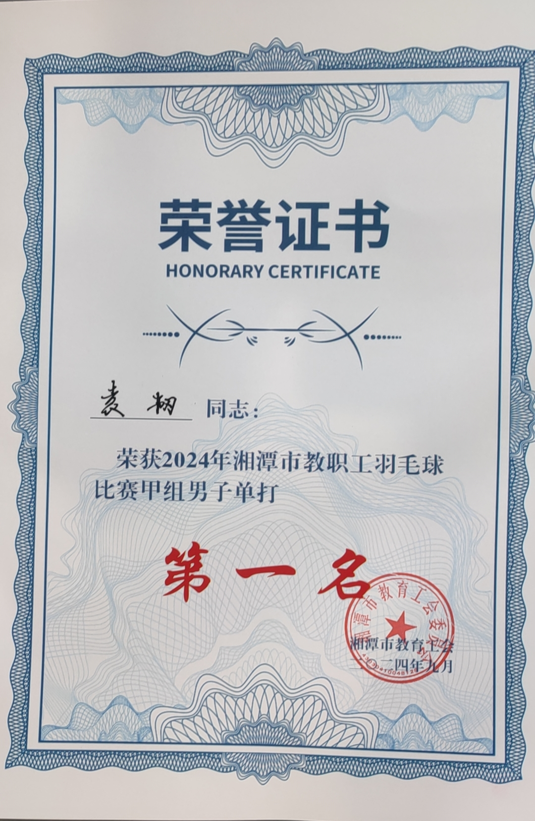9月29日,从湘潭市教育系统2024年教职工羽毛球比赛中传来喜讯,我校袁韧老师获得男单冠军,卢赛平老师和廖胜老师获得混双第五名,湘潭市一中代表队获得市直组团体第六名。