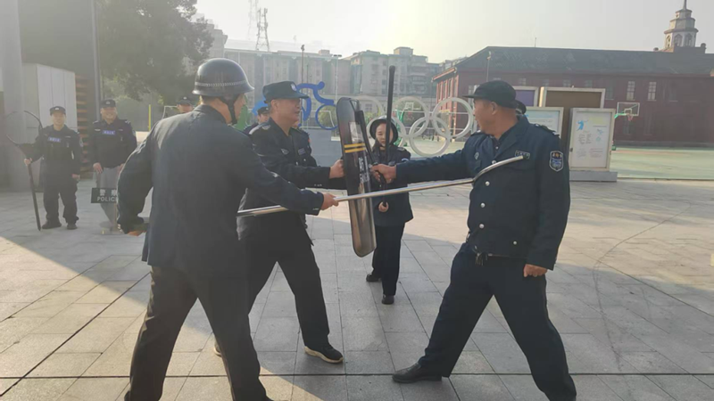 实操演练结束后,保安防爆演练紧接着拉开帷幕。演练模拟一名“不明人员”携带危险物品试图强行闯入校园,学校保安人员迅速反应,按照预设方案手持防暴盾牌、钢叉等专业器械,快速形成防护阵型,果断采取隔离、警告、控制等一系列规范措施,仅用几分钟就成功将“不明人员”安全制服。整个演练过程紧张有序、分工明确,不仅检验了学校保安队伍的应急处置能力和协同作战水平,也让师生直观感受了防爆应急的流程和要点,进一步增强了大家的安全防范意识和自我保护能力。
